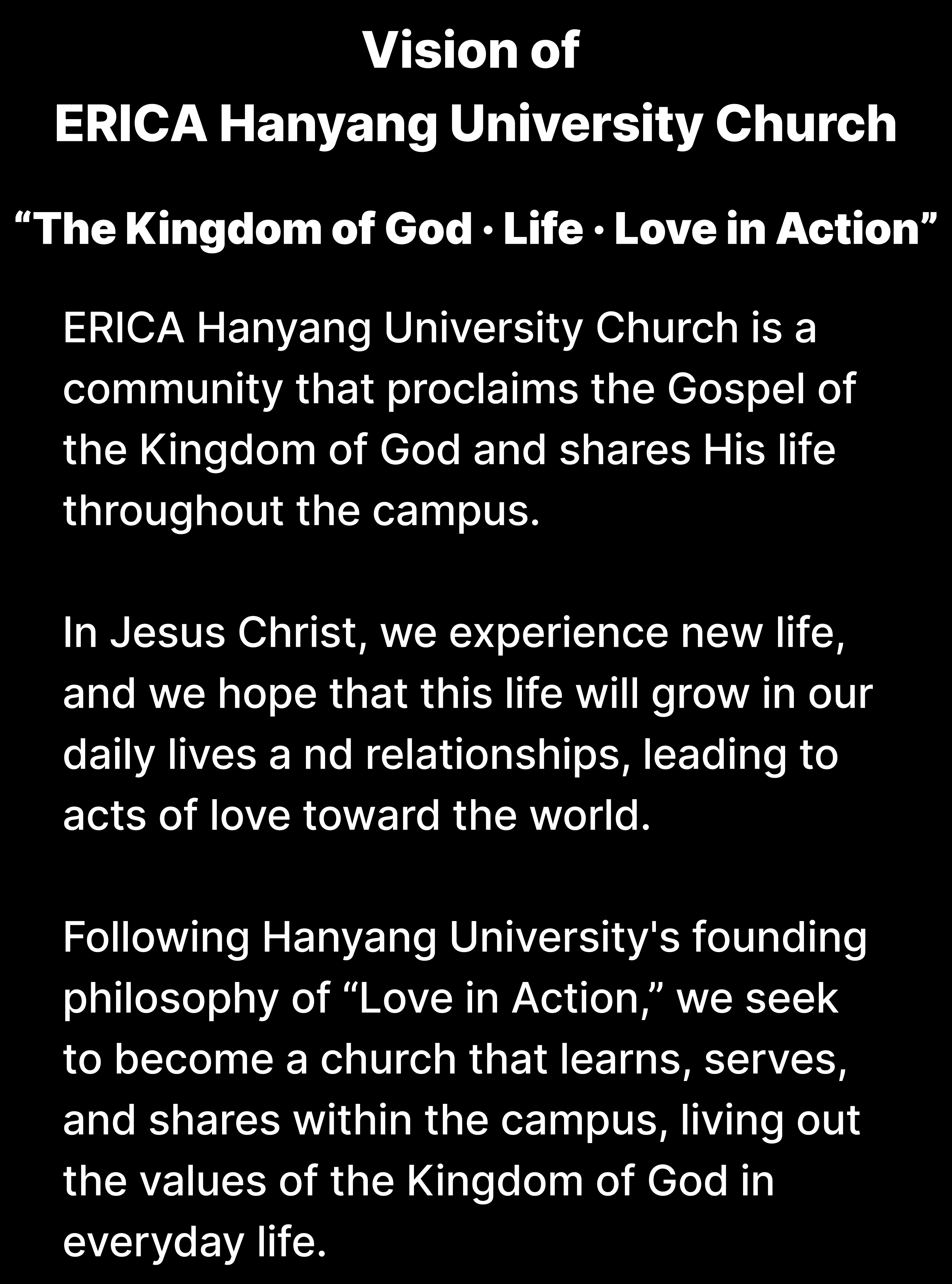 Following Hanyang University's founding philosophy of “Love in Action,” we seek to become a church that learns, serves, and shares within the campus, living out the values of the Kingdom of God in everyday life.